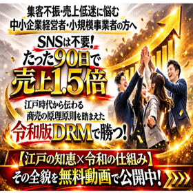集客不振・売上低迷に悩む 中小企業経営者・小規模事業者の方へ「たった90日で売上1.5倍」令和版DRMで集客を自動化し時間的自由・経済的自由・精神的自由を手に入れよう!😀